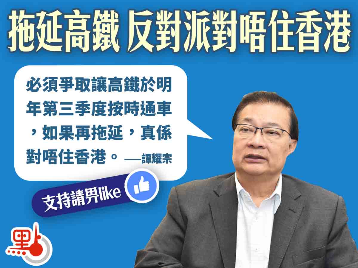 大公文匯全媒體記者黃杜煜報道:全國政協社會與法制委員會副主任譚耀宗近日在接受大公文匯全媒體記者採訪時指出,鐵路尤其是運載能力強的高鐵,對香港的發展至關重要,而「一地兩檢」則是高鐵效率的保證。他呼籲,必須爭取讓高鐵於明年第三季度按時通車。如果再拖延,那就真是「對唔住香港」,「對唔住市民」了。