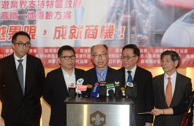 香港旅遊業議會、酒店業協會等15個業界團體昨日舉辦「『一地兩檢』方案說明會」,逾600名業界人士出席,多位立法會議員包括民建聯李慧琼、陳恒鑌、經民聯林健鋒、自由黨邵家輝、工業界吳永嘉,及旅遊界姚思榮都有到場。陳帆於會上解釋方案,強調高鐵通車有利於旅遊業界開發深度旅遊,如本港能連接中國高鐵網絡,可到達更多地方,遠至越南、東盟國家甚至歐洲。他預計,廣深港高鐵通車首日有10萬9千人次使用,局方會盡量配合旅遊業界的訴求,安排業界先參觀西九龍總站,盡早了解車站運作,又希望高鐵可仿效機場的海天碼頭,將下機轉乘高鐵旅客的行李,直接送到高鐵西九總站提取。