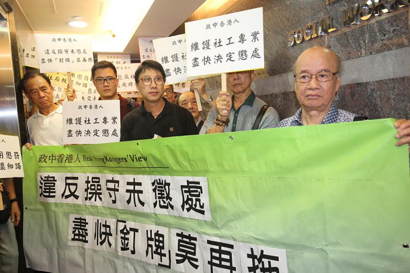 社工註冊局昨日早上再開會,討論由紀律委員會提出,對曾健超違反專業操守作停牌半年的懲處議案。約20名「政中香港人」成員則在社工註冊局外請願,高叫「犯事不用懲罰,社工教壞細路」等口號,該團體召集人劉礎慊向社工註冊局主席倫智偉遞交請願信。請願信指,曾健超雖已在六月被裁定違反專業操守,但對於其「釘牌」半年的建議,社工註冊局並未有決定,亦未有具體懲處措施。「政中香港人」認為,事情至今已拖延兩個月,社工註冊局應盡快決定,向市民公布具體懲處措施,以維護公眾對社工專業的信心。