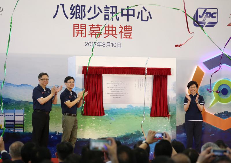 行政長官林鄭月娥、保安局局長李家超、警務處處長盧偉聰,昨日一同主持八鄉少年警訊永久活動中心暨青少年綜合訓練營(八鄉少訊中心)的開幕禮。
