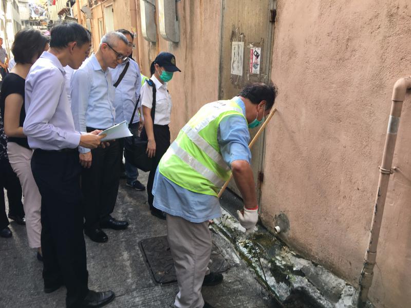 本港上周一(7日)45歲男子確診首宗本地登革熱個案,相隔僅兩天,再有一名25歲女子確診登革熱,兩人均居於太子,住所相當接近。食物及衞生局副局長徐德義、衞生署衞生防護中心總監黃加慶、食物環境衞生署助理署長林永康等人今午到太子砵蘭街附近一後巷視察,工人清理污水及滅蚊工作。