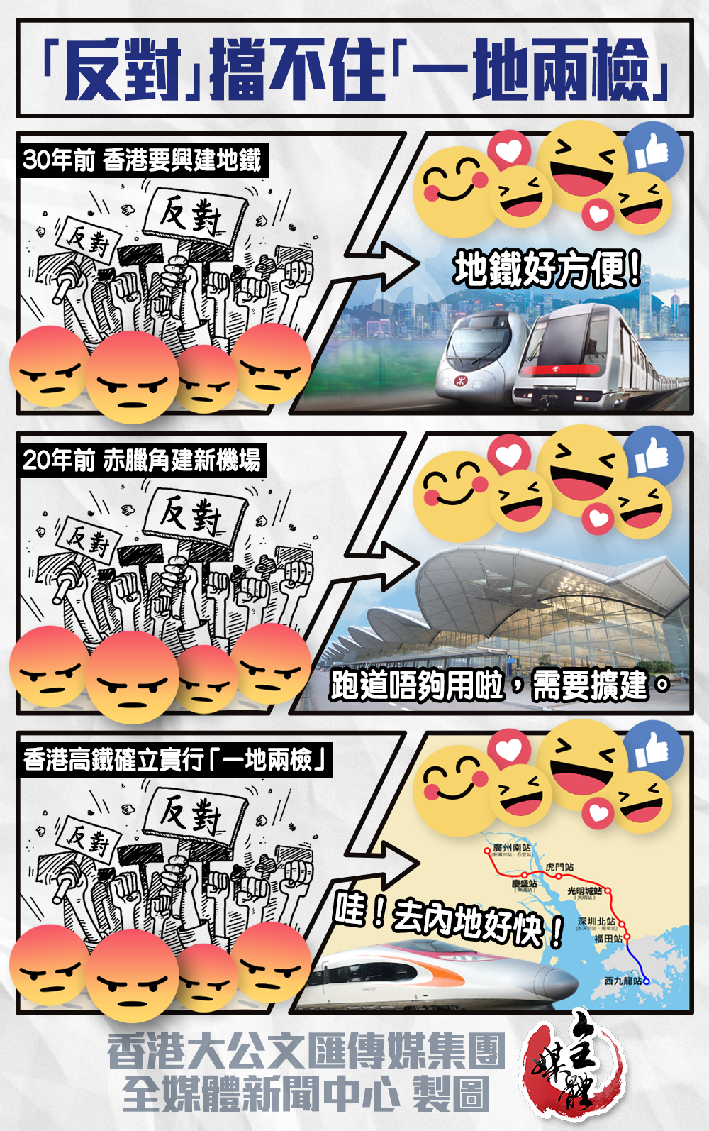 30年前香港興建地鐵遭反對,30年後港鐵將18區連在一起,成為許多市民出行不可或缺的一部分。20年前赤鱲角建新機場遭反對,20年後機場成為重要國際樞紐,甚至因運量太大正在加建第三跑道。如今,香港即將開通高鐵,並且將實行「一地兩檢」,卻遭到反對派百般抹黑,但高鐵「一地兩檢」是大勢所趨,未來將帶給港人實惠便捷,為香港帶來更多經濟發展新機遇,豈是幾聲「反對」就可以阻擋的呢?