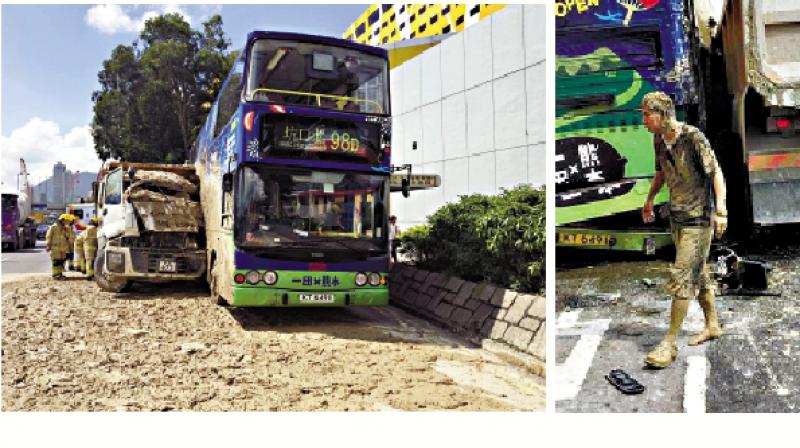 【大公報訊】九龍灣發生罕見交通意外,一輛滿載泥漿的泥頭車,昨午約2時30分駛至近九龍灣展貿中心對開時,患有腦痙攣病的司機報稱「暈一暈」,泥頭車失控撞向前方一輛剛離站的98D雙層九巴,車斗大量泥漿傾瀉而出,湧進泥頭車駕駛室及巴士上層車廂,路面亦一片泥濘。多名乘客及泥頭車司機頓變「泥人」,四名巴士乘客,包括三名女子(36歲至55歲),及一名兩歲女童,經送院治療後無大礙。警方正調查意外原因。涉事泥頭車司機姓黃(53歲),意外中沒有受傷,事後透露自己是腦痙攣患者,須長期服藥。