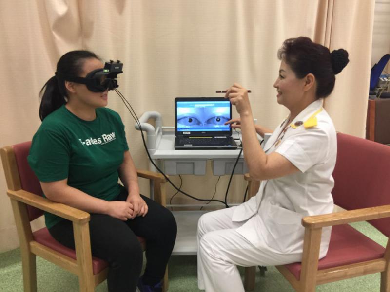 圖:劉慕儀(右)稱,物理治療方法首先使用紅外線眼鏡(如圖)全方位評估患者情況/大公報記者湯淩琰攝