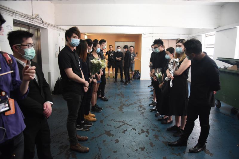 圖:美適工業大廈火警中三名死者家屬在單位外排隊等候進入火場致祭
