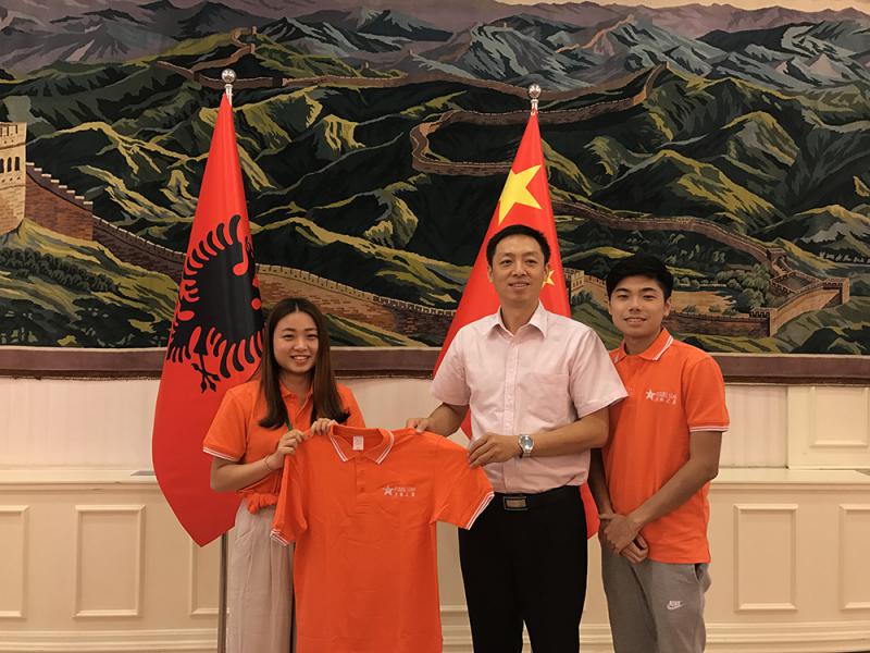圖:同學向白雲斌(中)臨時代辦致送「未來之星」團服