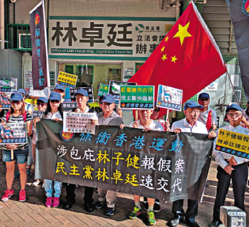 圖:保衛香港運動昨日到林卓廷的議員辦事處抗議,斥林子健說謊,並批評民主黨抹黑國家 大公報記者周禮希攝