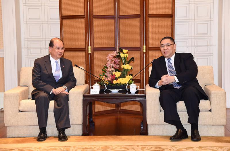 圖:張建宗(左)與澳門行政長官崔世安(右)會晤,就港澳兩地在經貿、跨境基建和青年事務等方面的最新發展及合作交流意見