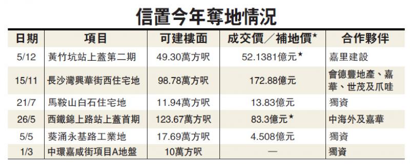 至於一直被冠稱為「大好友」的信置,今年應該是大豐收的一年,從一鐵一局及政府賣地,均有斬獲,亦是今年投得最多地皮的本地發展商。連同今次項目在內,信置年內以合資及獨資方式已投得五幅住宅地及一幅工業地,總地價超過300億元,總可建樓面超過300萬方呎,其中上月夥另外四家發展商,斥近173億元投得的長沙灣地皮,更是本港有史以來最貴的住宅地王。