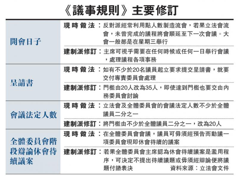 民建聯張國鈞表示,《國歌法》本地立法及基本法第23條立法等屬於政府議案,只要議會內有過半數議員贊成,毋須修改議事規則亦可以通過。他解釋,修改議規後仍不能杜絕拉布,只是希望能紓緩拉布的嚴重性,令全體委員會能回復正常的議事功能。他又提到中大日前的民調顯示,過半數市民都支持修改議規,質疑反對派危言聳聽,煽動民意。