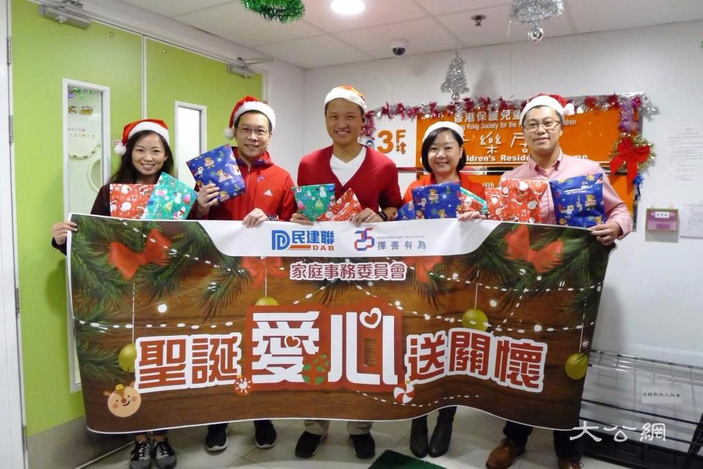 大公網12月8日訊:聖誕節就快來到,不少小朋友已經開始期待「聖誕老人」來送禮物。民建聯副秘書長鄭泳舜(Vincent)同民建聯家庭事務委員會主席鍾嘉敏及多名委員會成員,昨日就化身「聖誕老人」,探訪香港保護兒童會「童樂居」近100名3歲以下嬰幼兒,同他們提早過聖誕,又大派禮物。
