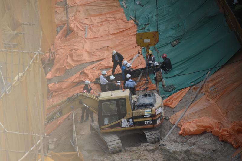 圖:警員及勞工處人員事後到場調查,涉事工字鐵事後仍在地盤內