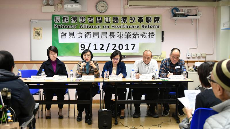 由多個病人組織組成的長期病患者關注醫療改革聯席,昨日與陳肇始及醫院管理局八個代表會面,就七大範疇提供建議,包括醫療資源、增加醫護人力資源、制定基層醫療健康策略、藥物名冊、改革醫務委員會、改善公營醫療服務,及因應人口老化作醫療服務準備。