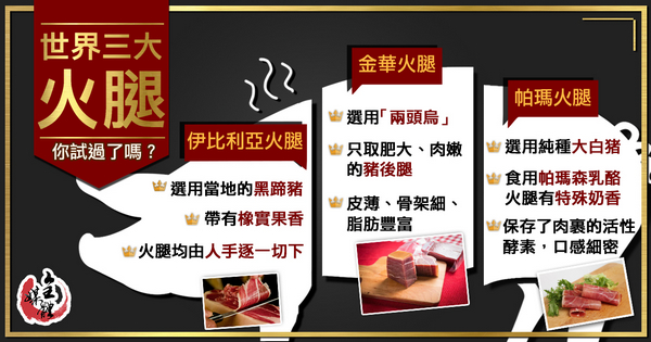 近日掀起了一陣西班牙火腿熱潮,被譽為西班牙「國寶」的伊比利亞火腿,成為一眾美食家,尤其是內地食客的新寵。當地火腿供不應求,價格持續上漲一成。但除了西班牙火腿之外,還有兩種火腿並列世界三大火腿,每一種都令人垂涎三尺,欲罷不能,你試過了嗎?