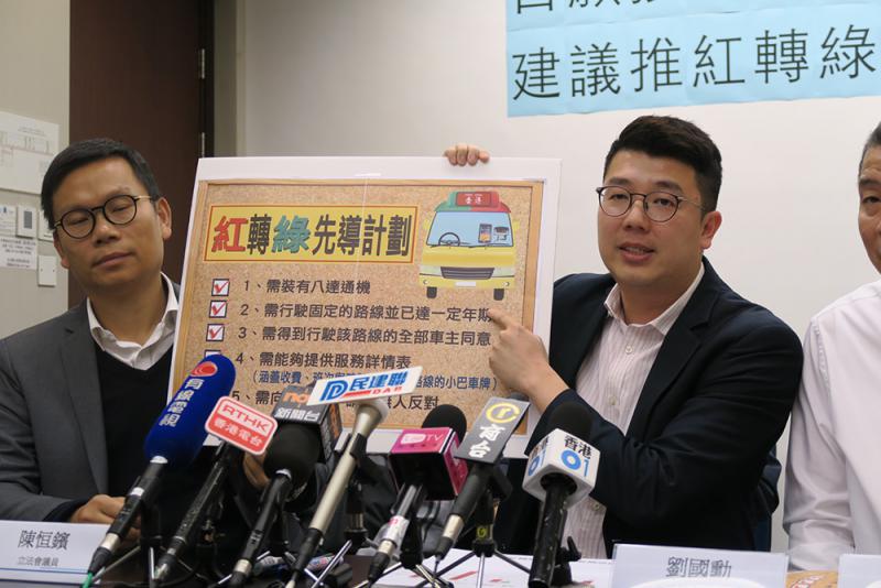 民建聯立法會議員劉國勳稱,政府一直鼓勵紅巴轉為綠巴,但過去十年僅約300輛小巴「紅轉綠」,主要因為過程必須透過運輸署公開招標,曾有提出「轉色」的路線原有營辦商在招標落敗,被其他營運者投得路線,令業界抗拒,拖慢「轉色」速度。他建議政府推行「紅轉綠」先導計劃,凡安裝八達通機、行駛該路線有一定時間(約五年),而該線全部車主同意,並能夠提供包括收費、班次的服務詳情表,運輸署應讓有關紅巴線轉為綠巴線繼續經營,毋須公開招標。
