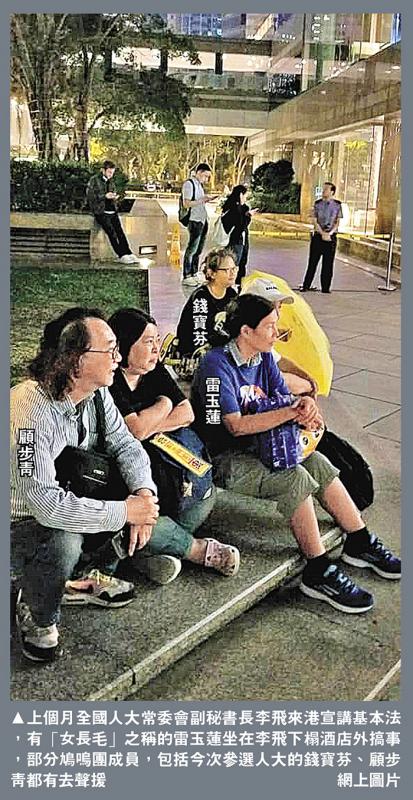 圖:上個月全國人大常委會副秘書長李飛來港宣講基本法,有「女長毛」之稱的雷玉蓮坐在李飛下榻酒店外搞事,部分鳩嗚團成員,包括今次參選人大的錢寶芬、顧步青都有去聲援/網上圖片