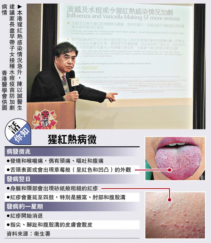 醫學會會董、兒科專科醫生唐繼昇(圓圖)表示,近期天氣變化、抵抗力差及季節性流感等多方面因素影響,令猩紅熱個案出現回升,預料本月至下月的感染情況會持續上升。猩紅熱是由甲類鏈球菌引致的細菌感染,潛伏期為一至三天,病徵如感冒,包括發燒、喉嚨痛、身體和頸部出紅疹等,尤其是低燒,家長容易忽略這病徵。