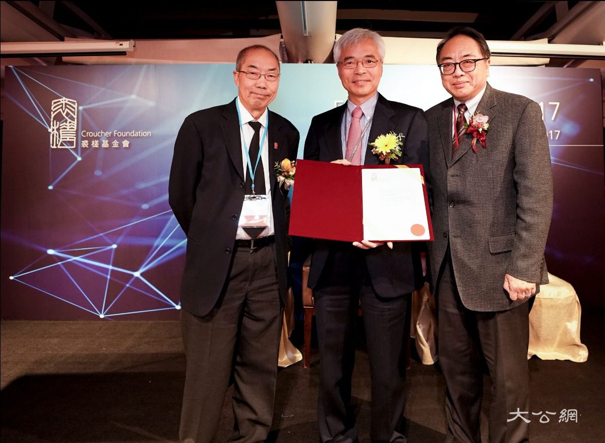 張教授於裘槎基金會頒獎典禮上獲裘槎基金會董事局主席麥德華(左) 及港科院院長徐立之(右)頒發裘槎優秀科研者獎2018-2019 照片來源:裘槎基金會