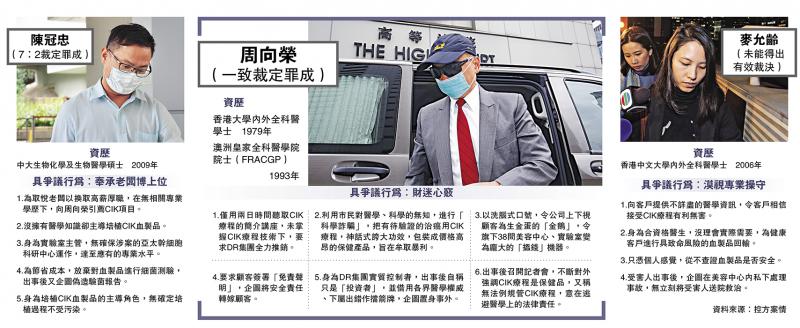 一度令全城嘩然的DR醫學美容事故誤殺案,經過100日審訊,昨午得出裁決。案中首被告、DR醫學美容集團創辦人周向榮,以及負責培植血製品的次被告陳冠忠,均被陪審團裁定誤殺罪成,即時還押。負責為死者陳宛琳回輸血製品的醫生麥允齡,則未達有效裁決,獲當庭釋放。主審本案的法官張慧玲表示,本案是香港首例,希望控辯雙方搜集類似的案例供法庭參考,預計在下周初判刑。麥允齡案件則有待控方索取法律意見,或可能面對重審。/大公報記者梁康然(文) 麥潤田、何嘉駿(圖)
