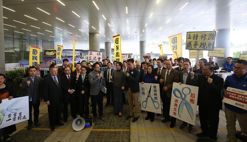 昨日早上,民建聯約30人到立法會示威區請願,他們高舉「反拉布,保民生」的標語,又高呼「修改議事規則,議會重回正軌」等口號。另外,珍惜群組、愛港之聲等團體亦有到場。民建聯副秘書長鄭泳舜認為,很多民生、基建議案因「拉布」而未能通過。同時,有民調顯示過半數市民反對「拉布」,他期望立法會可以一氣呵成完成修改議規。