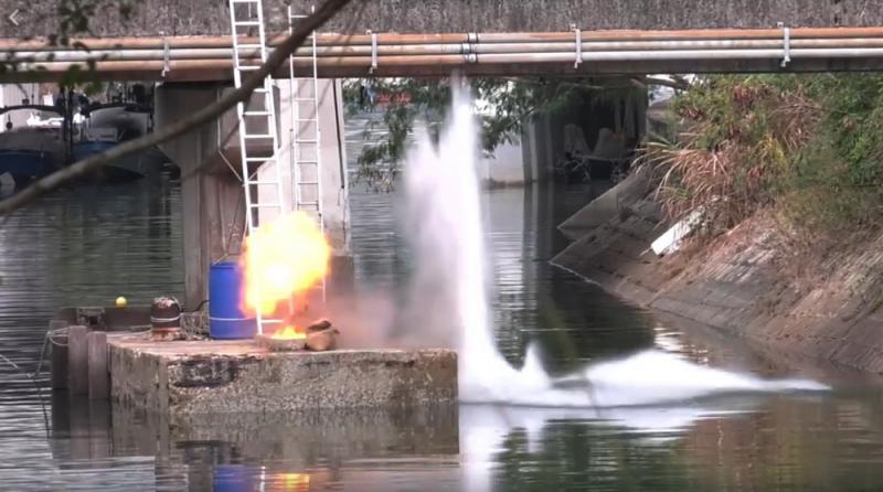 圖:迫擊炮彈引爆一剎冒出光及激起水花 /警方圖片