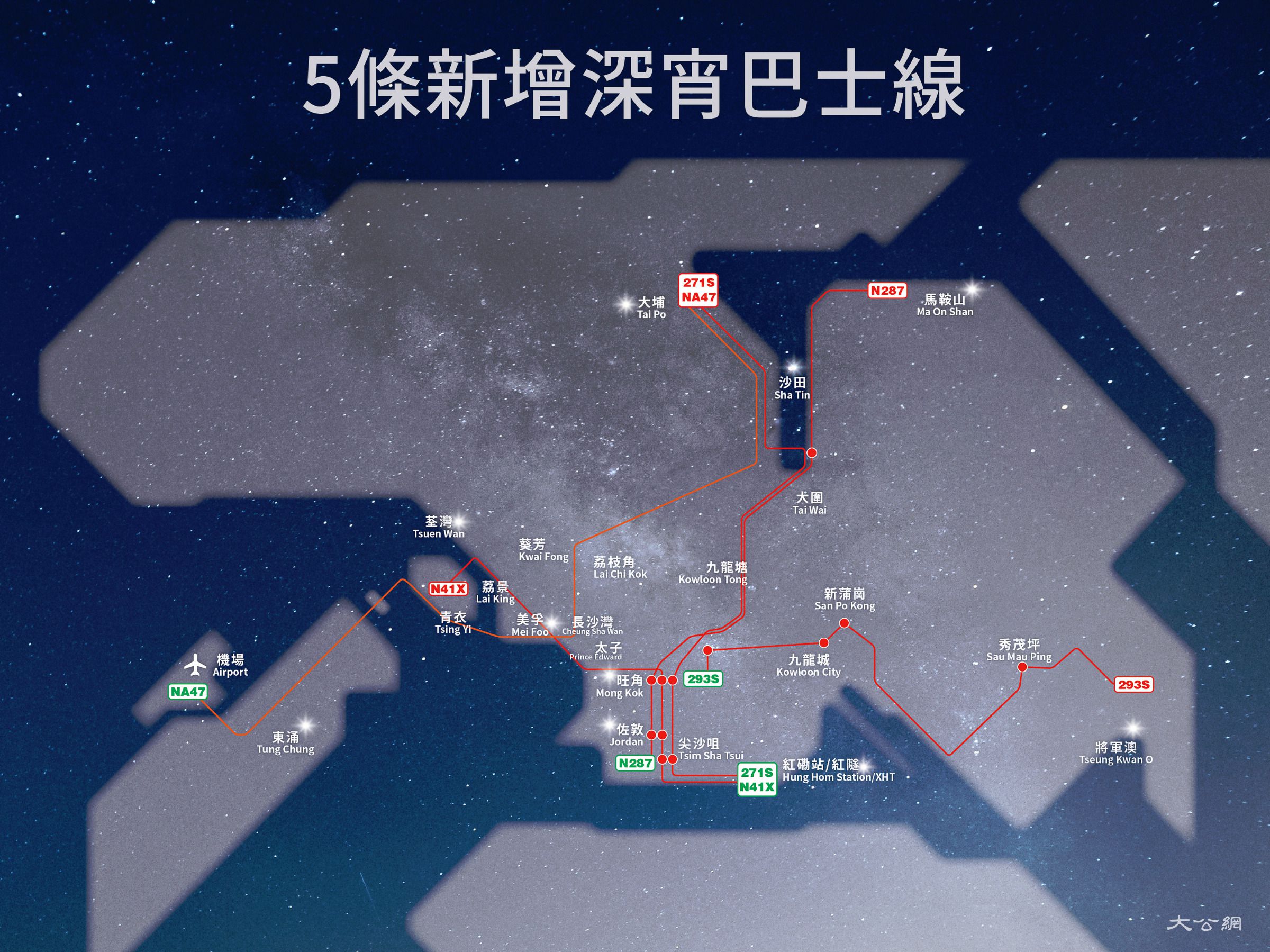 對於近年市民夜歸需求增加,九龍已先後在10月30日至12月11日,分別增加5條深宵「特快線」(詳見另表)。九巴商務及資產管理部襄理(業務發展)梁領彥稱,新增的「特快線」主要是減少中途站並改行幹道,令行車時間縮減,各「特快線」的車程都會比原有通宵普通線快最少20分鐘。他指,原有通宵普通線的班次不會回「特快線」而減少。同時,九巴又在其網頁及手機程式「App1933」內,增加獨立的深宵巴士服務資訊,方便夜歸人。