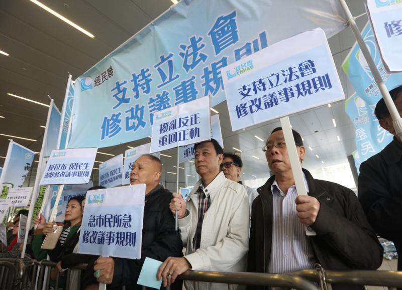 經民聯及西九新動力成員昨日在立法會示威區高舉「反『拉布』,保民生,盡快修改議事規則」、「撥亂反正,重回正軌」等標語。他們表示,收到很多街坊對「拉布」的不滿,因為反對派不斷拉低議會尊嚴,擾亂議會秩序,拖慢撥款,傷害立法會,猶如跳樑小丑。所以經民聯全力支持立法會撥亂反正,盡快修改議事規則。