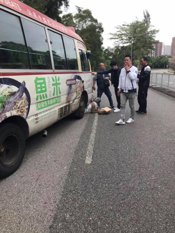 消防員接報到場,將被困車底老婦救出,當時她仍清醒,經即場包紮後由救護車送往屯門醫院治理,未有性命危險,警員在場向肇事姓黃小巴司機錄取口供,調查意外原因,現場遺下老婦的手推車及數疊紙皮、麵包等雜物。