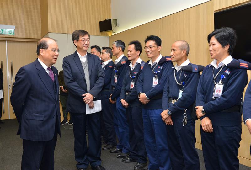 圖:張建宗(左)昨與政總保安員會面,對兩名受傷保安表達關注及慰問,又感謝保安員盡忠職守
