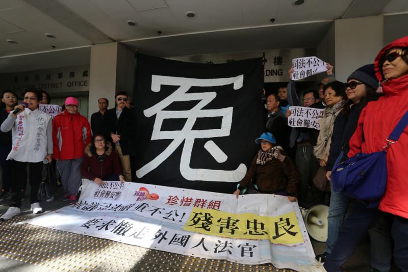 圖:市民在法院門外拉起「冤」字橫額聲援朱經緯\大公報記者何嘉駿攝