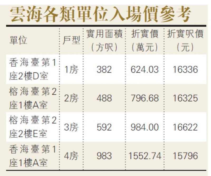 至於鄰近開賣中的新盤長實(01113)星漣海,去年三月首批93伙平均折實近1.4萬元,不足一年雲海賣貴22%,反映雲海開價進取。