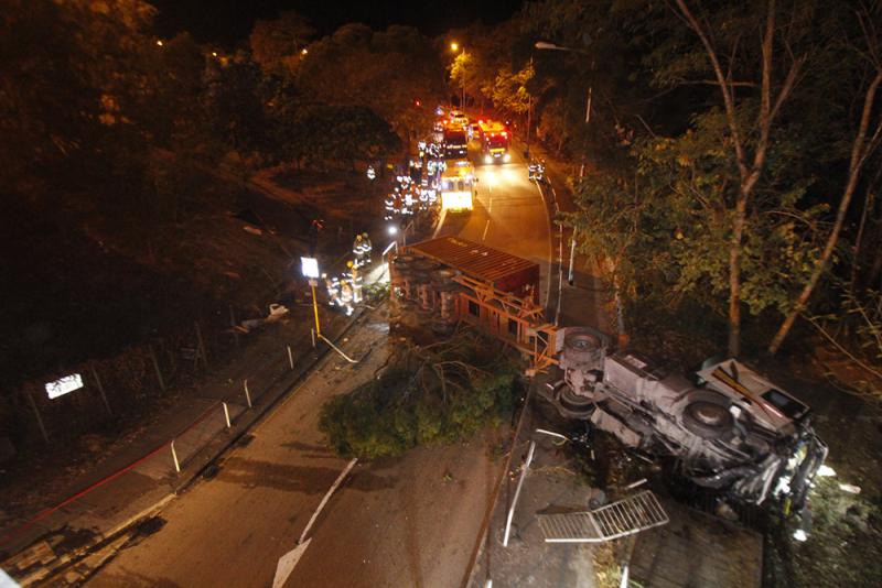 大欖隧道轉車站釀一死四傷慘劇的大車禍。消息透露,車禍疑與有人打瞌睡有關,前日事發時,已經開工16小時。而肇事貨櫃車當時以「擔煙斗」的方式行車,即是將一個20呎長的貨櫃,放置於40呎長的拖架末端,專家指出,這種作業方式可能令貨櫃車更易失控。有物流業人士向《大公報》透露,公司昨日已發出指示,即時禁止司機以「擔煙斗」方式擺放貨櫃。\大公報記者 陳卓康 黃俊華