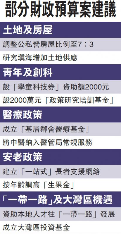 【大公報訊】記者李淇報道:新一屆政府首份《財政預算案》將於下月底出台,新民黨八名代表昨午與財政司司長陳茂波會面,就預算案提交多項建議,包括增加土地供應,公私營房屋比例由六比四調整為七比三,並希望政府改變保守作風,捉緊國家「一帶一路」及大灣區的發展機遇,善用公帑解決社會問題。新民黨主席葉劉淑儀稱,陳茂波對部分建議感興趣,要求更多資料作研究。