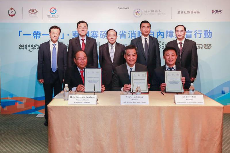 圖:梁振英(前排中)與柬埔寨衛生部簽署協議,計劃兩年內助當地萬名白內障致盲病人復明