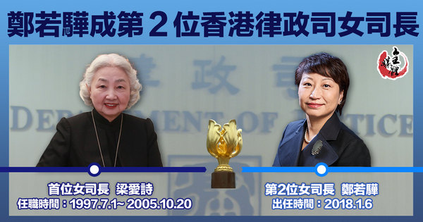 國務院今日(5日)任命鄭若驊為香港律政司司長,自2018年1月6日起生效。繼首位女性律政司司長梁愛詩後,鄭若驊將成第2位出掌律政司的女司長,亦是首位擔任此職的女性資深大律師。鄭若驊在港曾擔任多項公職,有「女公職王」之稱。對於獲任,鄭若驊表示,能在新崗位繼續為香港服務,是榮譽也是挑戰。自己會用一向的信心信念,盡自己所能,以專業知識和經驗貢獻香港社會。