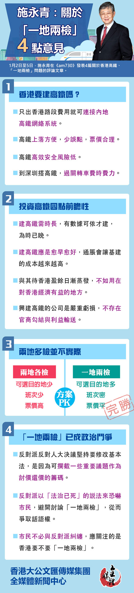 大公文匯全媒體綜合報道:1月2日至5日,香港中原集團主席施永青在《am730》上發表4篇關於香港高鐵和「一地兩檢」的評論文章。文章從多個角度論述了香港為何要興建高鐵,「一地兩檢」為何是最優選擇,反駁了反對派將「一地兩檢」作為政治鬥爭工具的惡劣行徑。施永青強調,新科技取代舊模式乃歷史必然,高鐵取代舊鐵亦是大勢所趨。香港選擇早建,既可以節省成本,又可以早讓港人享用新科技所帶來的好處,是具前瞻性的決定。