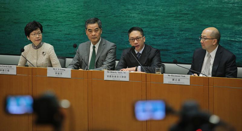 圖:2016年11月7日,時任行政長官梁振英(左二)舉行記者會表示,特區政府支持全國人大常委會11月7日通過的關於香港基本法第104條的解釋。左三為律政司司長袁國強