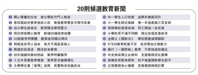 另一方面,去年校園內的政治風波鬧得滿城風雨,「港獨」思潮、《國歌法》、「一國兩制」教育、中史科定位等,均引發社會廣泛討論;興德學校校政風波亦令「影子學生」問題再次浮面,有關新聞紛紛入選為今次選舉的候選名單。