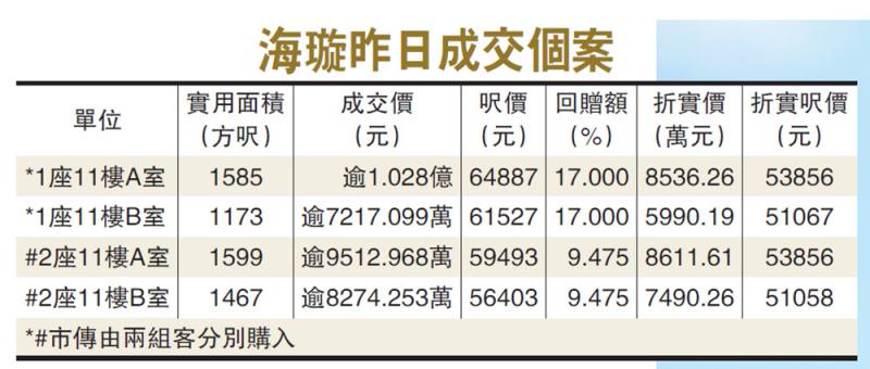 北角海璇去年底打破成交裂口後,昨日連環沽四伙兼再錄新高價。海璇成交紀錄冊顯示,其中一座11樓A室及B室兩伙,實用面積1585方呎及1173方呎,成交價1.028億元及7217.0995萬元,呎價高見64887元及61527元,連環破港島東分層新高,有指兩伙由一組買家買入,涉資逾1.7億元。