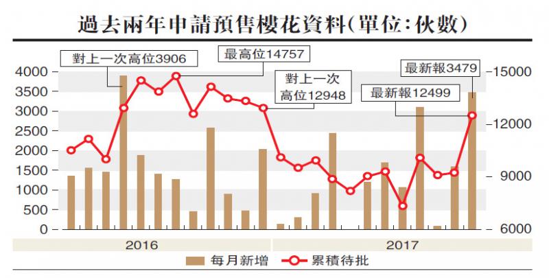 由於發展商要盡早準備今年的賣樓部署,地政總署過去兩個月已收到十份新樓花預售申請,涉及逾5000伙樓花單位,為近年半少見現象;亦令截至上月底的累積待批住宅預售書24份,共涉單位達12499伙,是去年全年新高,按月升逾35%。當中以來自將軍澳日出康城及大埔白石角的單位量較多,各佔3992伙及2593伙。