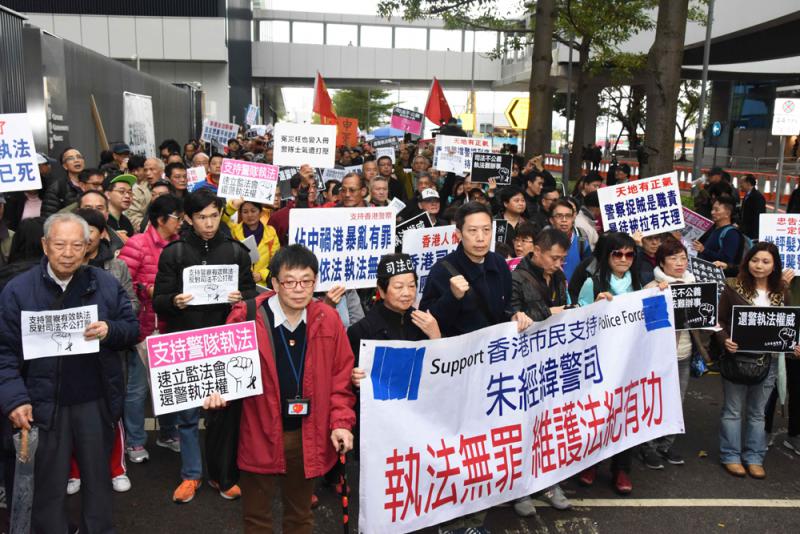 圖:遊行人士拉起「執法無罪」橫額支持警隊及朱經緯\中通社