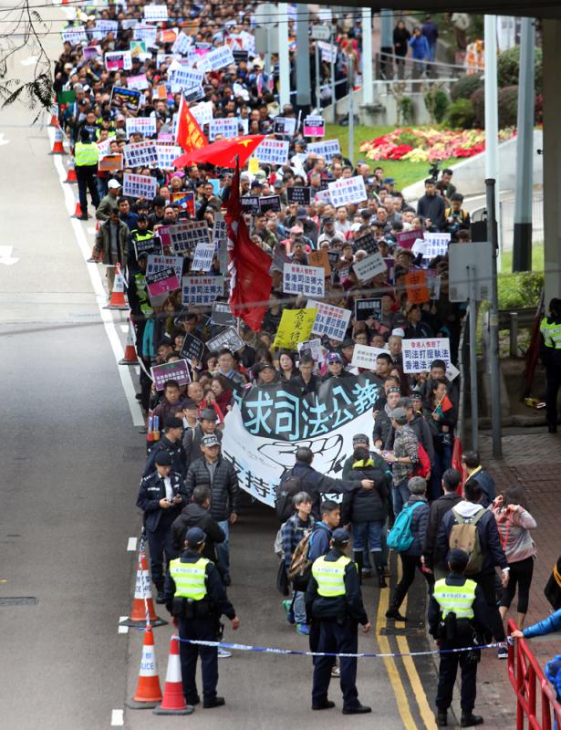 退休警司朱經緯在非法「佔旺」期間執勤,被指打傷市民而判囚三個月,引起市民不滿,齊聲呼冤。昨日天氣寒冷時有微雨,但無損市民撐警熱忱,有7000市民參與「聲援警察執法大遊行」,支持警隊執法及要求成立「監察司法委員會」。警務處處長盧偉聰昨日首度公開回應朱經緯被判囚一事,稱感到「極之難過」,警隊將在福利事宜上全力支援朱經緯及其家人。盧偉聰又表示,違法「佔中」79日在香港歷史從未出現過,警隊是首次面對這種複雜環境,已成立工作小組,檢討使用武力的指引、程序及訓練。」大公報記者 楊州 文軒