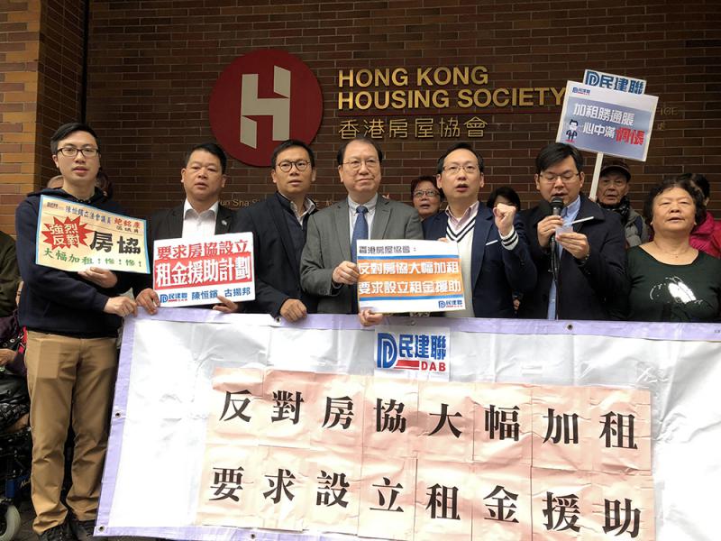 圖:民建聯到房協位於大坑的申請組示威,要求房協凍結租金