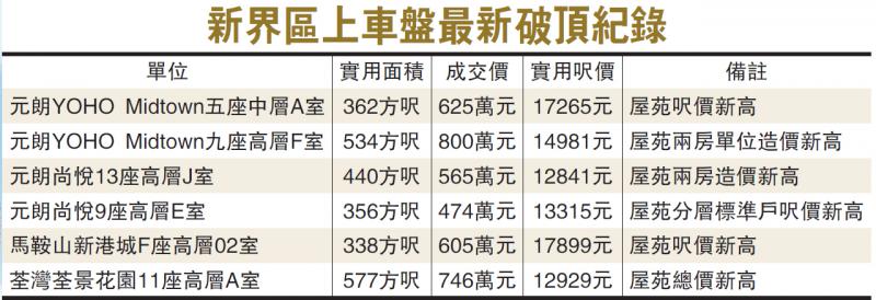 樓價升勢未止,新界上車盤輪流破頂,元朗、荃灣以至馬鞍山均現癲價個案,尤以元朗最誇張,區內YOHO Midtown及尚悅的一房及兩房單位,均相繼創新高;另馬鞍山新港城呎價直逼1.8萬元,比上月底紀錄1.7萬元搶貴超過5%。\大公報記者 林惠芳