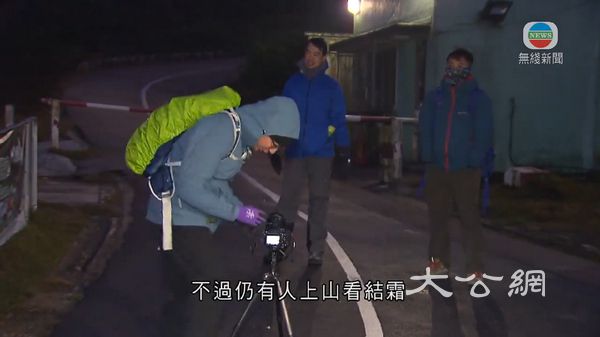 有市民身穿整套禦寒衣物,由清晨五時半上山看結霜(電視截圖)