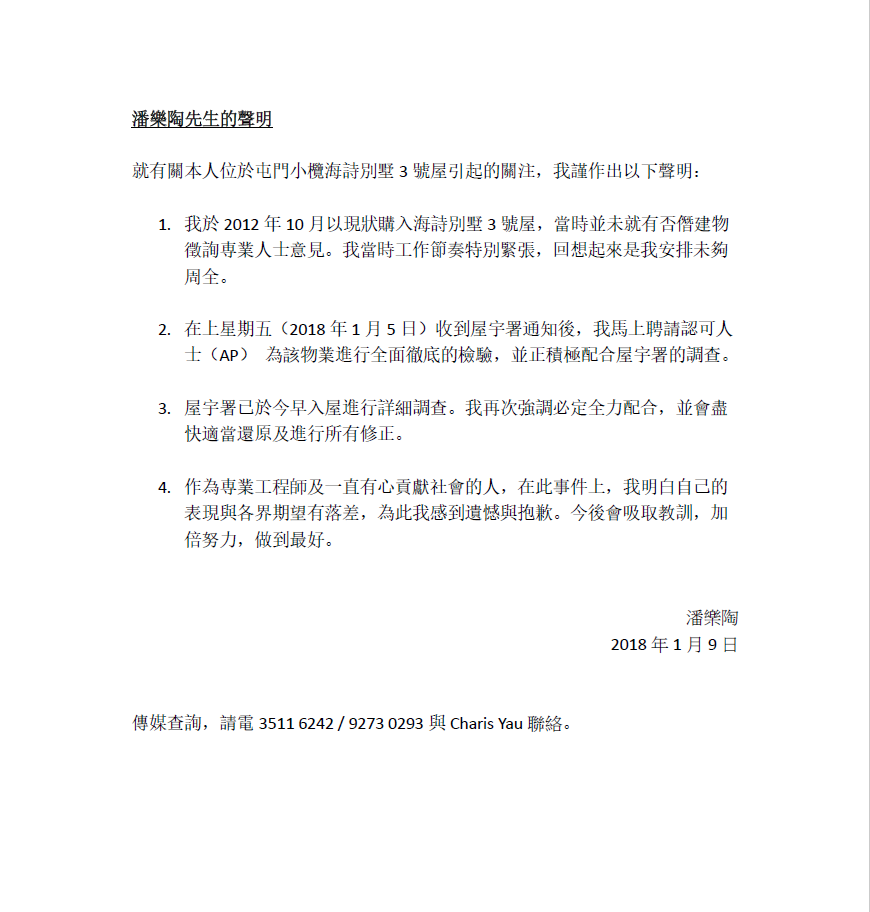 潘樂陶於聲明中解釋,於2012年10月以現狀購入3號屋時,並未就有否僭建物徵詢専業人士意見,因當時工作節奏特別緊張,安排未夠周全。他表示5日接到屋宇署通知後,馬上聘請認可人士為物業進行全面檢驗,積極配合署方調查,並會盡快適當還原及進行所有修正。