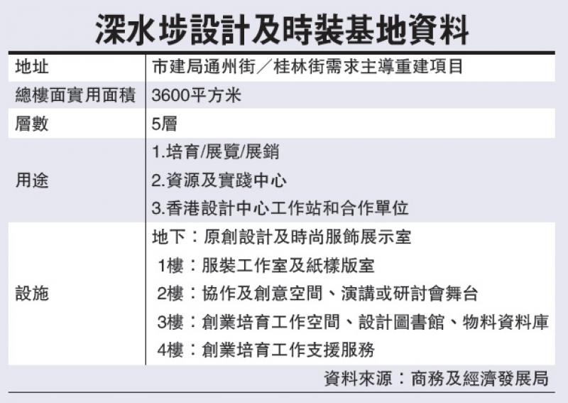 有關建議昨日由商務及經濟發展局局長邱騰華落實,將租用市建局通州街/桂林街需求主導重建項目內的五層商業樓面,打造設計及時裝基地,總樓面實用面積約3600平方米,建議交由香港設計中心營運。他稱,市建局於去年12月的董事會會議上,同意並通過建議,並計劃為有關項目招標及開展建設工程。