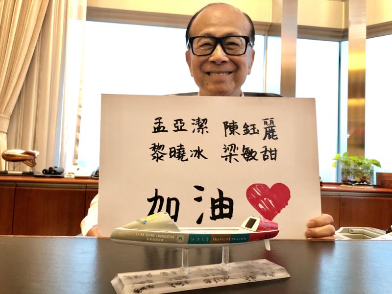悄悄話你知,鄭晴這段日子不停為四位加油鼓勁,與鄭晴一樣激動的,還有一直關注「功夫茶茶」的基金會主席李嘉誠。他還緊貼潮流做埋「YouTuber」,拍視頻送給四女將,變身「功夫茶茶」的粉絲,舉着啦啦隊紙牌說真心佩服她們,並熱情打氣。他在片中說道,「你們太酷啦!真佩服你們的勇氣和毅力!」又讚揚她們承載着汕頭大學「有志、有識、有恆、有為」的教育改革精神,為她們感到自豪。