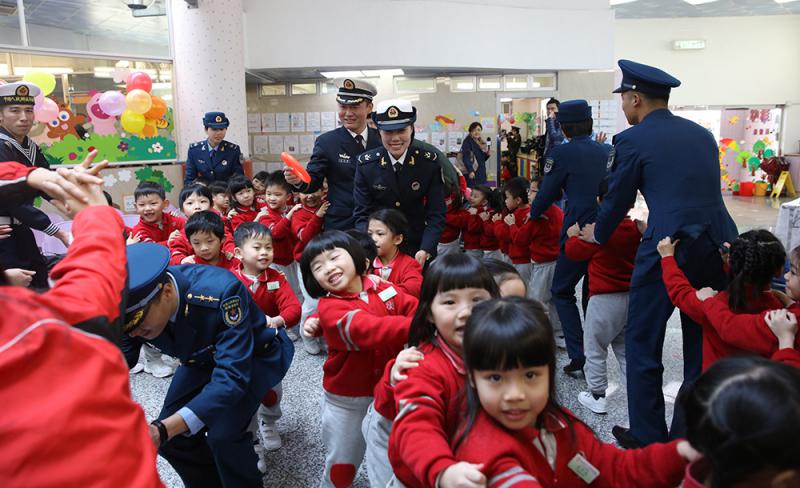 眾人隨後分成多組進行遊戲及做手工,數十名小朋友與官兵玩「火車捐山窿」,強烈的身高對比無阻他們遊玩,官兵們紛紛蹲下穿過由小朋友築起的「山窿」,小朋友將雙手盡量舉高,互相配合下眾人打成一片,有小朋友主動擁抱官兵,向他們說「謝謝」,亦有部分學生與官兵一同製作相架。