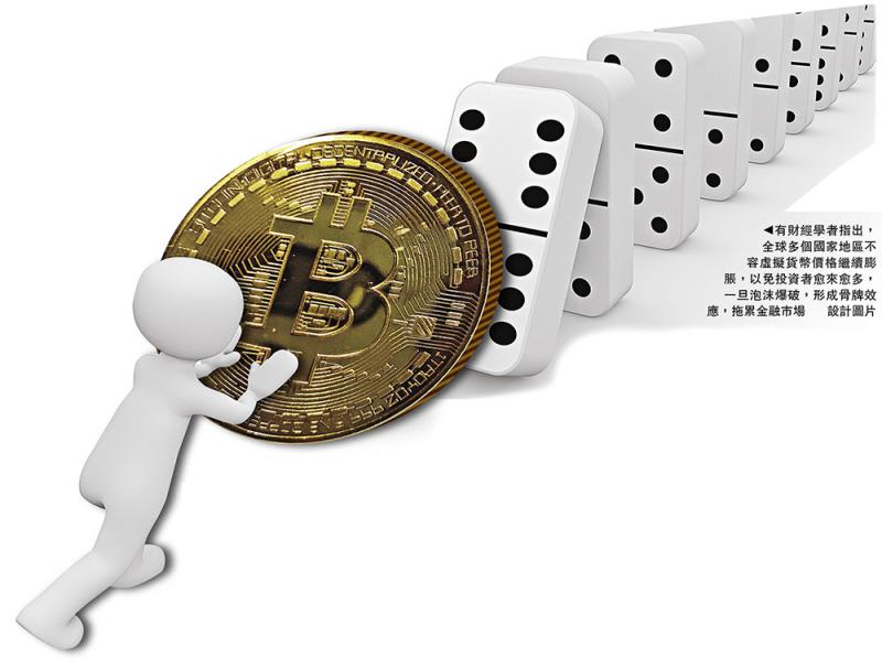 圖:有財經學者指出,全球多個國家地區不容虛擬貨幣價格繼續膨脹,以免投資者愈來愈多,一旦泡沫爆破,形成骨牌效應,拖累金融市場/設計圖片